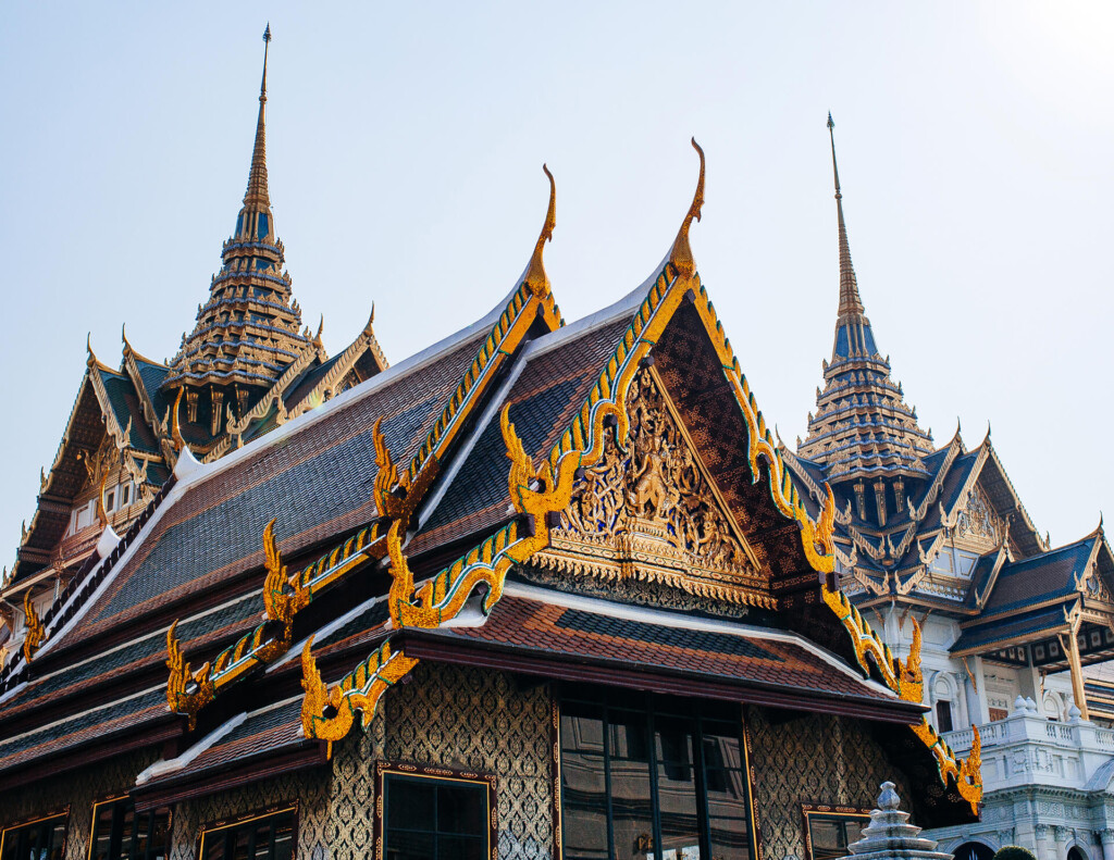 Grand Hindu mandir architecture at sunrise, intricate stone carvings, soft golden light rays